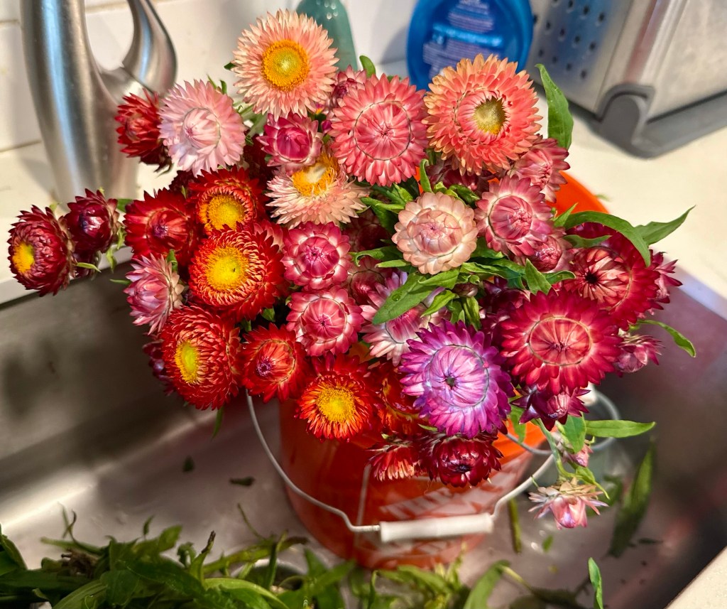 We haven’t had a freeze yet, so many of the flowers continue to blossom. Picked today, these straw flowers just keep getting prettier! Looks like we might have a lot of flowers for the Thanksgiving table this year.