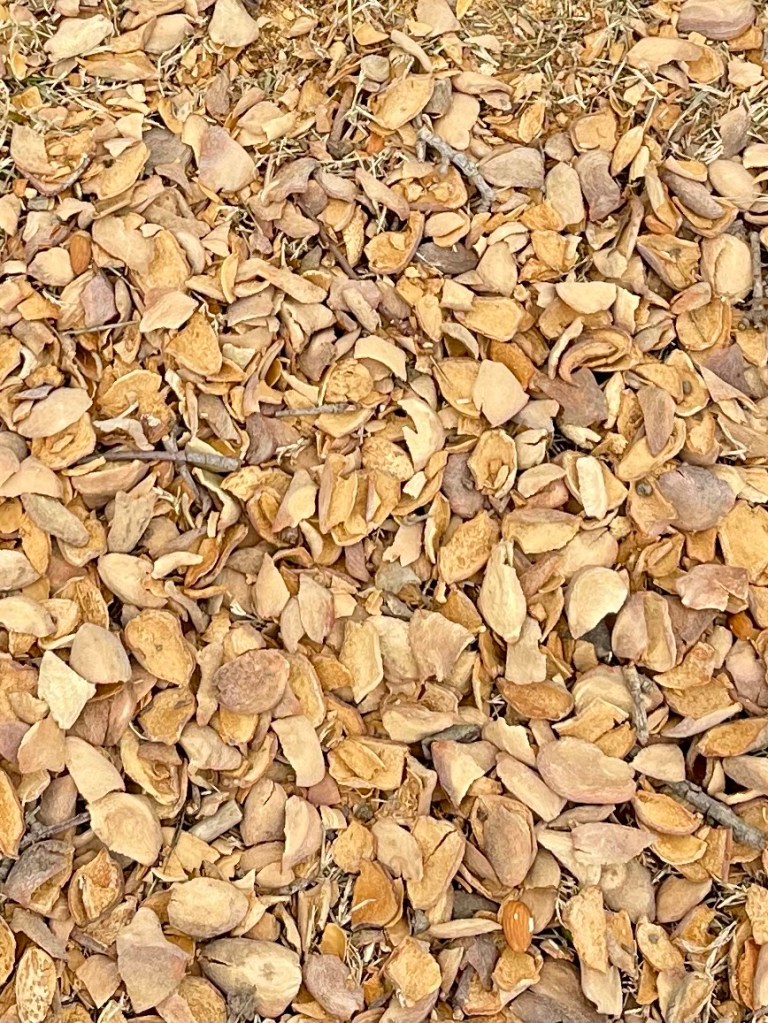 I brought in several yards of almond hulls to spread on top of the pathway weed barrier, but a more knowledgeable neighbor told me that they will get very slimy and stinky when they get wet. So I removed them and put them down as a base for a row of squash etc this summer. I will put the permeable planting barrier over the top once it all gets packed a little better. The row by the fence will be for tomatoes so that I can tie the vines to the fence for support.