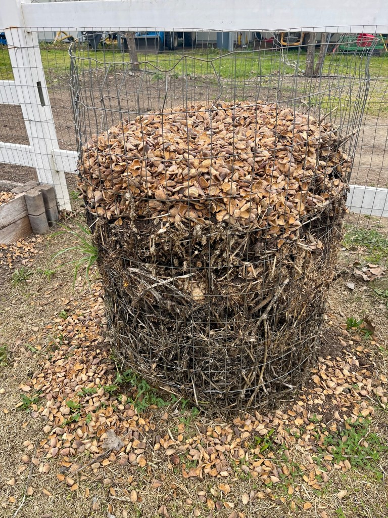 I used some old fencing material to use for composting. I added wood chips, from our pruning, grass clippings, almond hulls, sheep manure/straw and I introduced 1,000 worms between my six composting cylinders around the yard. Each compost cylinder will produce one yard of compost/worm castings over time.
