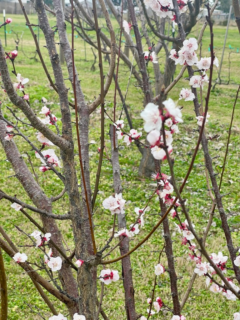 The apricots and plums and apriums and pluots have started to blossom.
