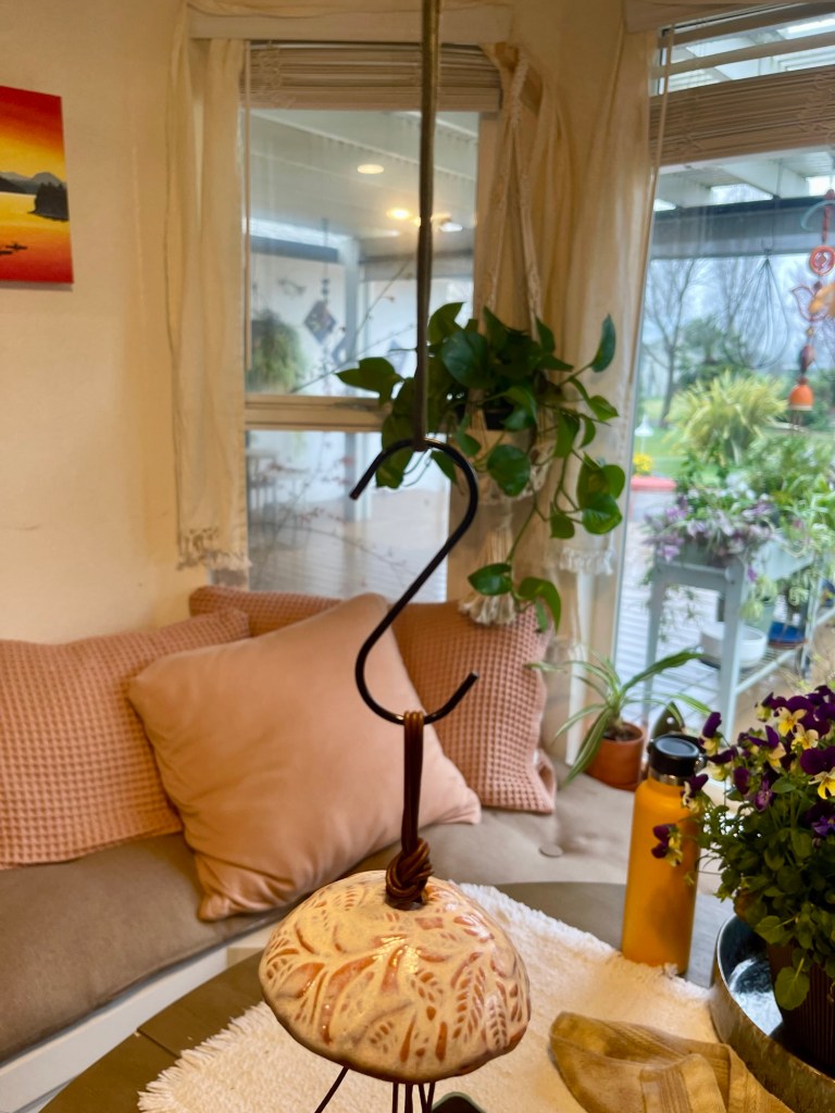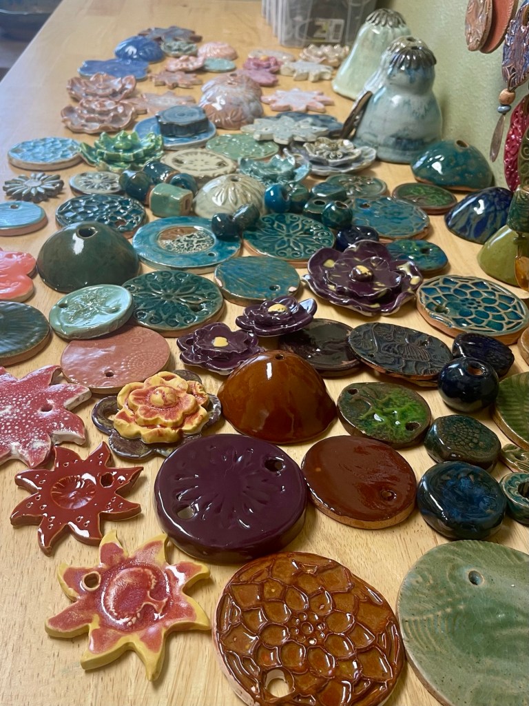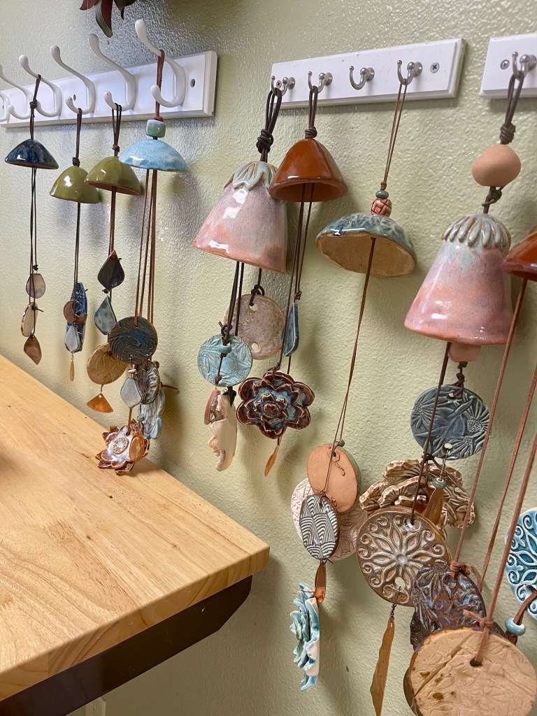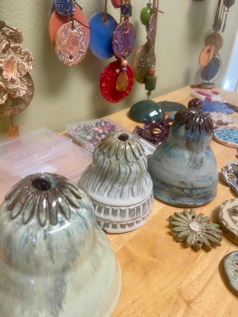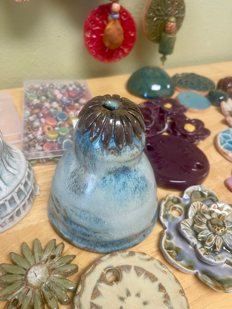 The bell shapes are created for the top of the design and then the smaller pieces are added. Out in the pottery studio now are some clay birds- well actually there are also some real birds flying around looking for a safe nesting area – drying and waiting for the fire of the kiln. They might become part of the next group of garden pretties.